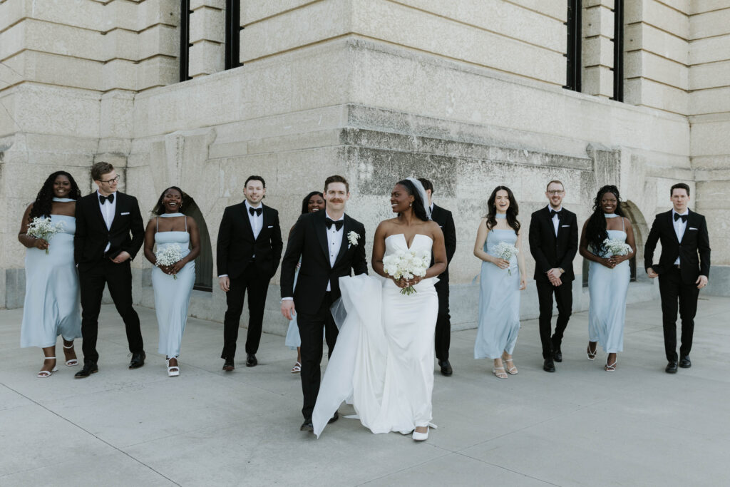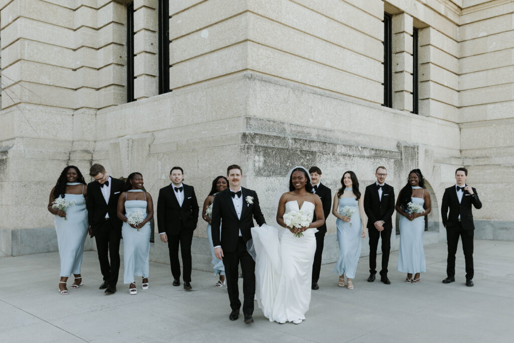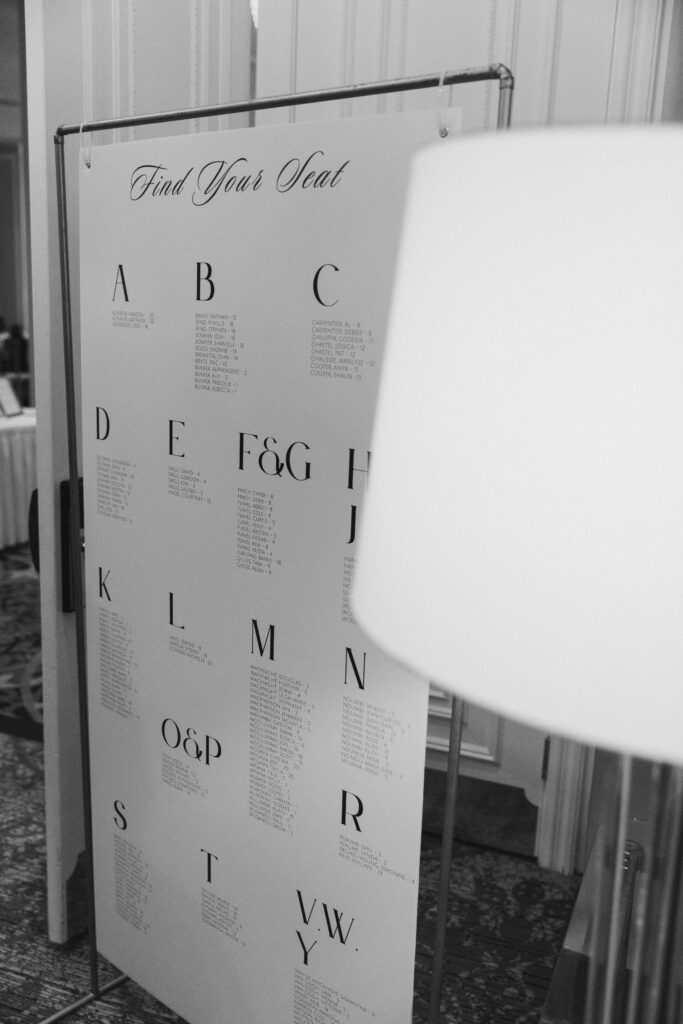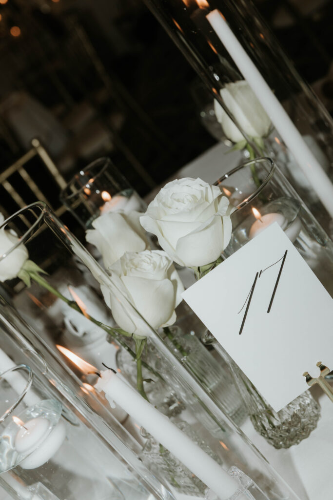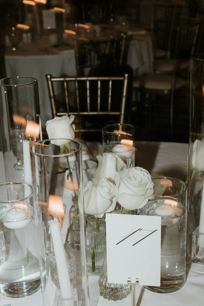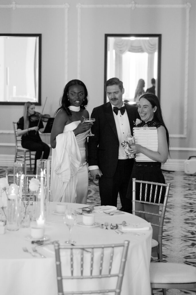 Following their ceremony, guests were welcome back later in the afternoon for cocktail hour and the reception. The couple headed out with their bridal party and the every lovely Brooklyn Caroline Photography on a Peekaboo limo for photos while the Wish team began flipping the Regency Ballroom for their reception. We had just 2 hours to transform the space for nearly 200 guests moving chairs, loading in tables, centrepieces, decor, and all the personalized touches that Chancelle & Scott were dreaming of. With time to spare, we nailed their vision. Every name card in place, every favour placed with care, and each centrepiece styled to perfection.