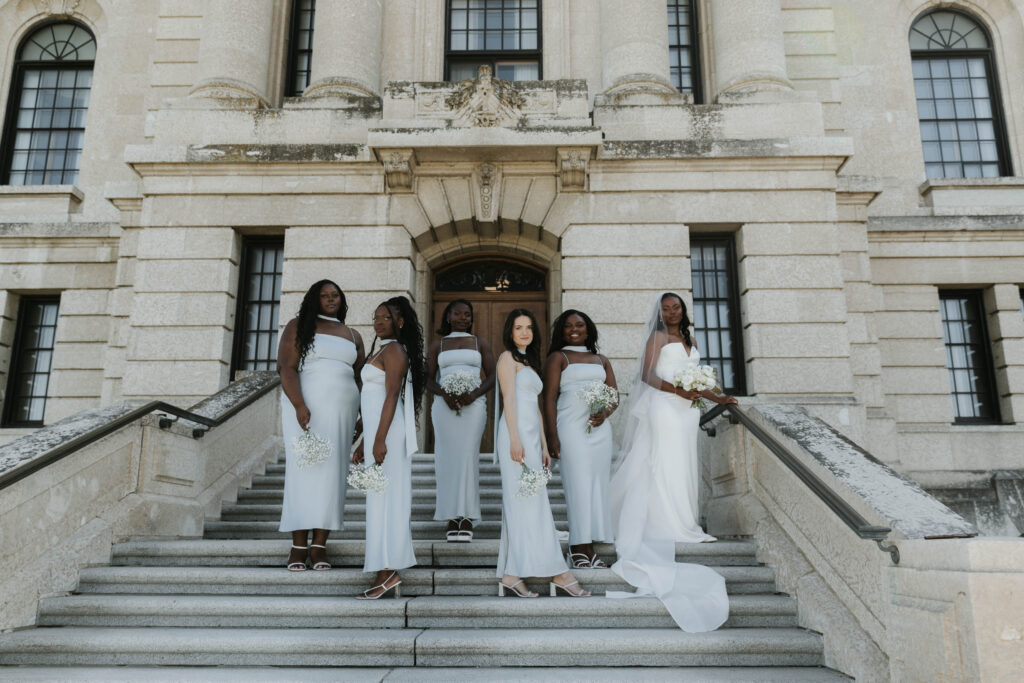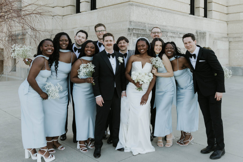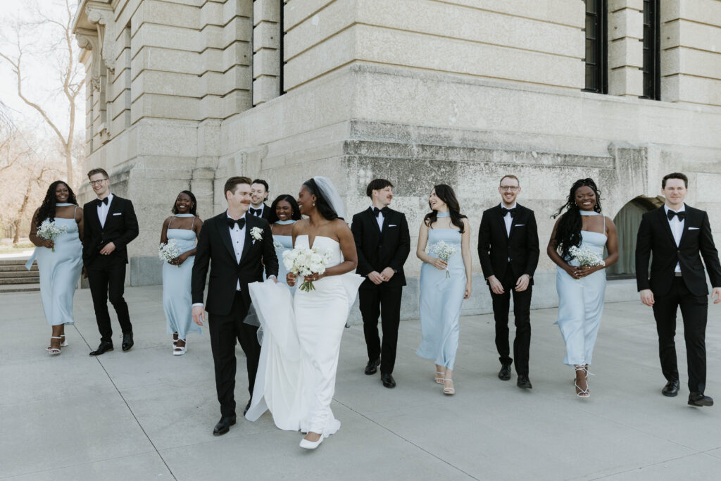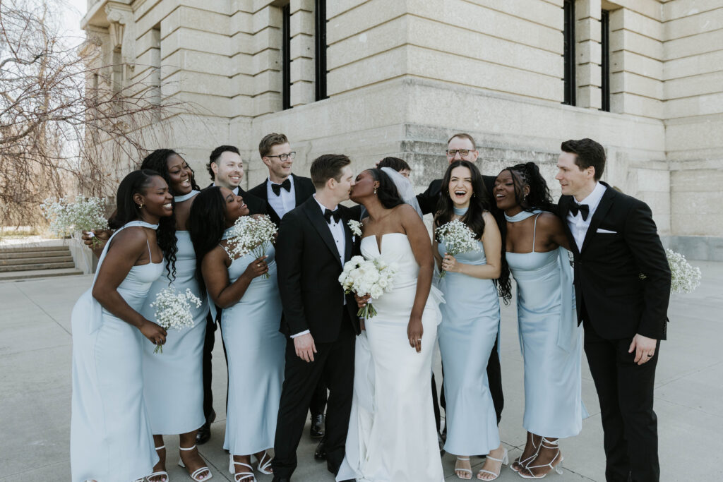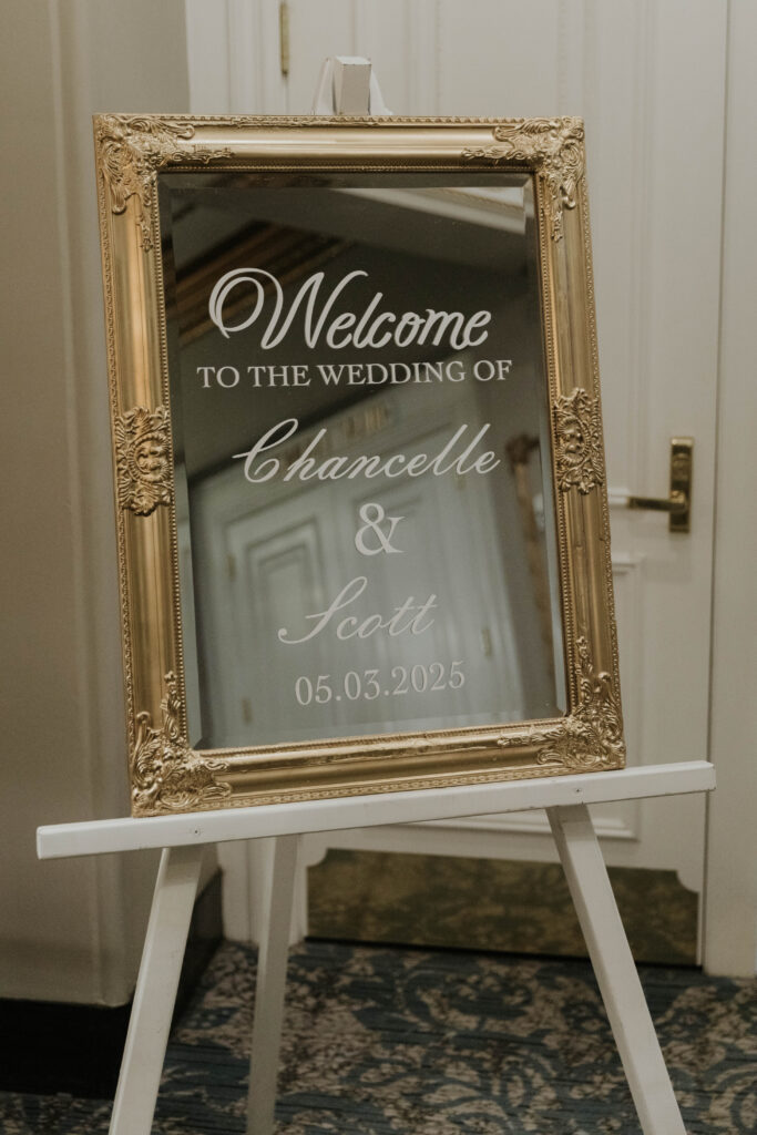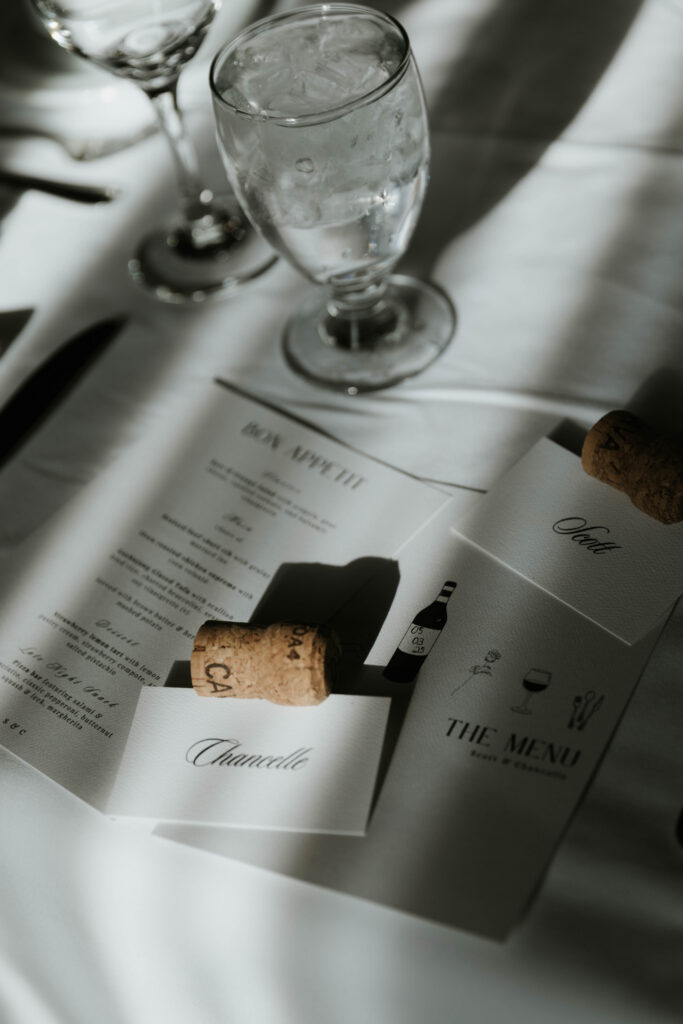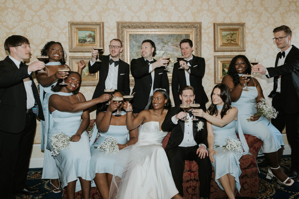 Following their ceremony, guests were welcome back later in the afternoon for cocktail hour and the reception. The couple headed out with their bridal party and the every lovely Brooklyn Caroline Photography on a Peekaboo limo for photos while the Wish team began flipping the Regency Ballroom for their reception. We had just 2 hours to transform the space for nearly 200 guests moving chairs, loading in tables, centrepieces, decor, and all the personalized touches that Chancelle & Scott were dreaming of. With time to spare, we nailed their vision. Every name card in place, every favour placed with care, and each centrepiece styled to perfection.