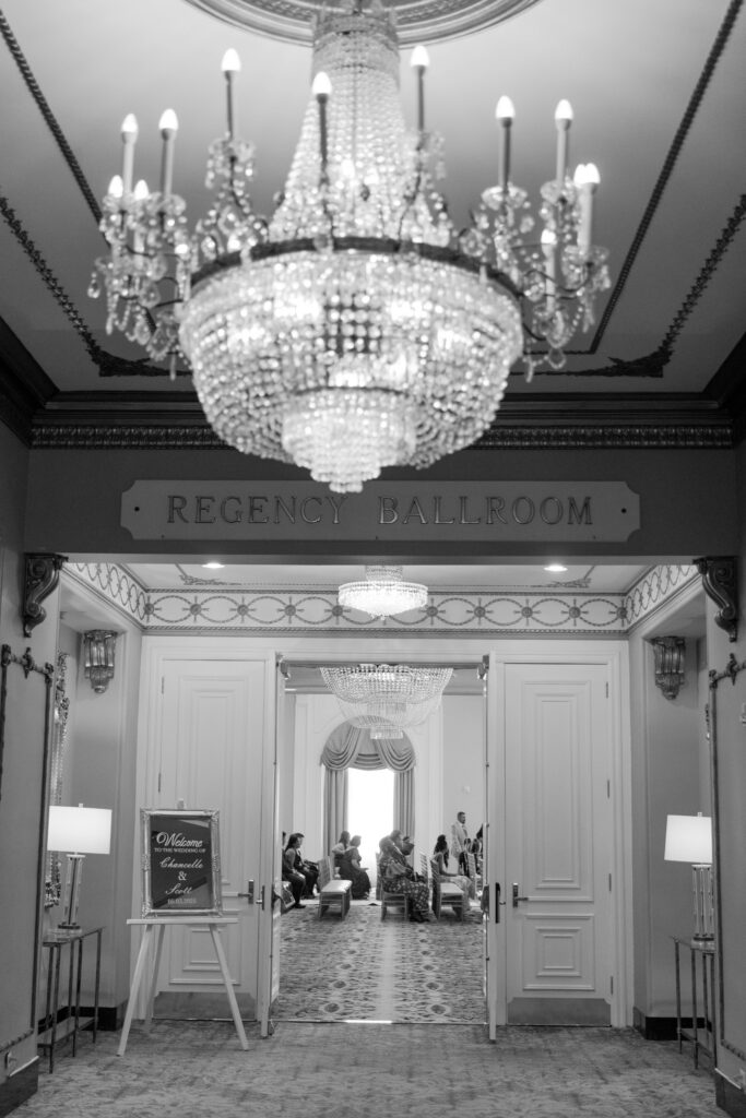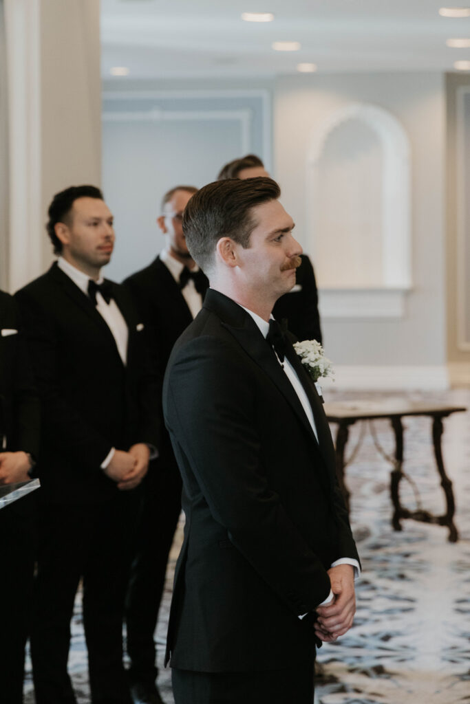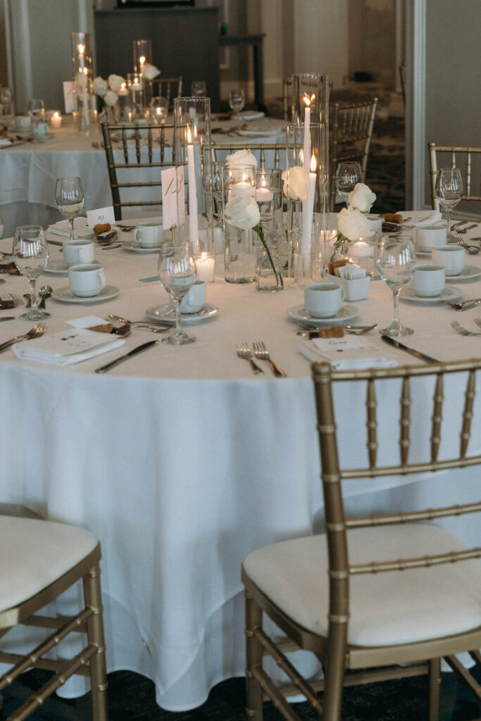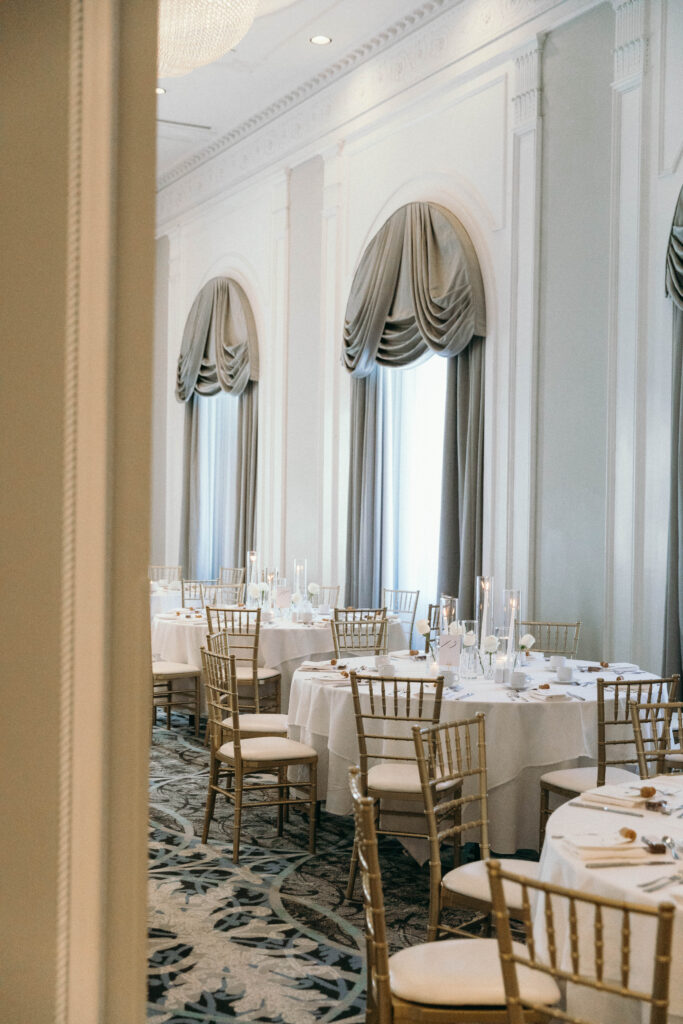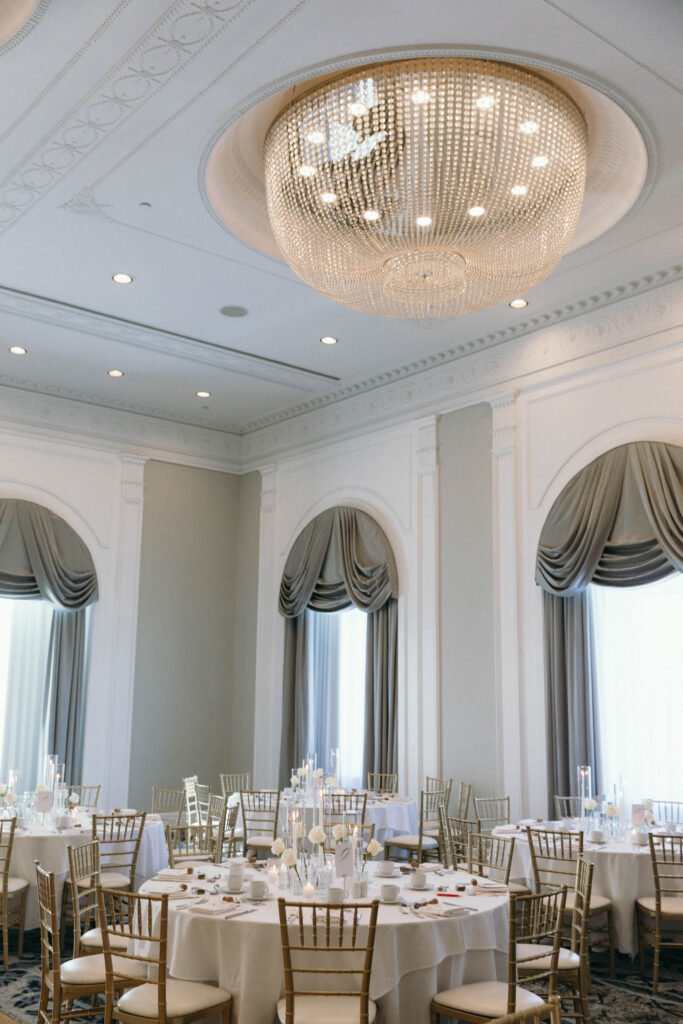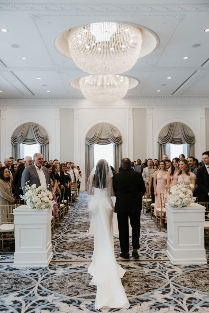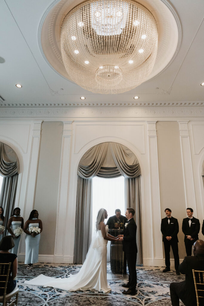 As guests arrived in the Regency Ballroom, they were welcomed in by The Listesto Trio – a string quartet covering a number of the couples favourite songs. It was the perfect way to set the tone and vibe for their black tie affair! The room was tastefully decorated with gold chivari chairs and stunning white rose florals designed by Eva Joy Designs with the crystal chandeliers on full display. Chancelle walked down the aisle toward Scott with her dad to a rendition of ‘No One’ by Alicia Keys; a moment we had carefully planned together that was more perfect than we ever could have dreamed.